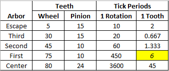 This is notable because it is the period of time it takes to advance one tooth in the first-to-second arbor gear mesh. I’ve compiled a list of tick periods to keep an eye on, since the period of the irregularly often indicates the source of it.