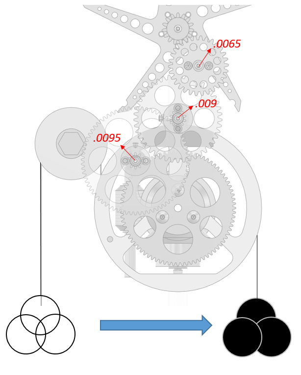 I have made an adjustment to the gear depthing at the 10T:80T joint but shifting the midplate bracket slightly. I have also experimented with shifting some weight to the direct (downwards pulling) side of the drive wheel. This causes significant deflection in the gear train as shown below and changes the gear engagements as a result. The design original called for a weight distribution between the two locations to be adjustable, however I’m finding that the clock runs most consistently with all the weight on the upwards pulling side. Overall variation is at 48 ms (1σ) vs 61 ms (1σ).