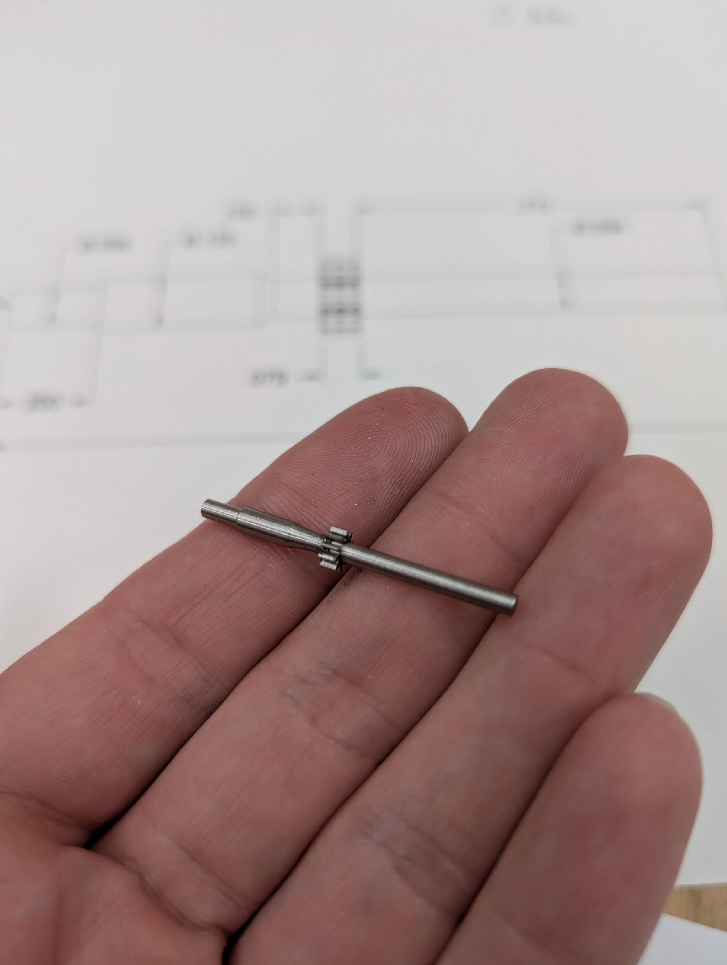 First for the calculation gears are those with pinions small enough that they have to be machined integral to the arbor. There are three: Arbors A, B, and O. The first two have 11T M0.4 pinions, and O has a 10T M0.4. The strategy is to machine one side of the arbor only, just removing clearance material from the back side. Move to the mill, cut the teeth, then move back to the lathe to cut the remaining profile.