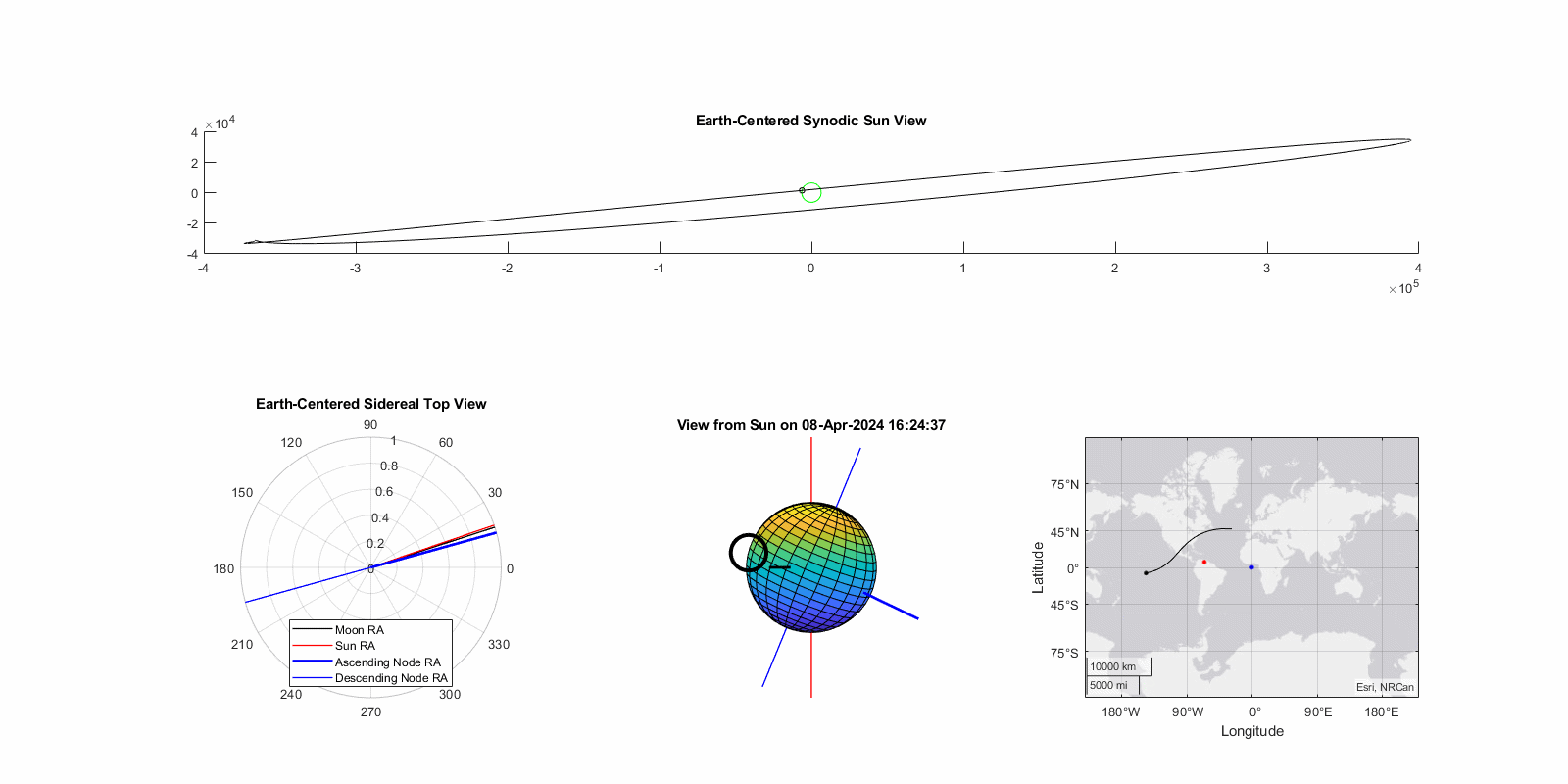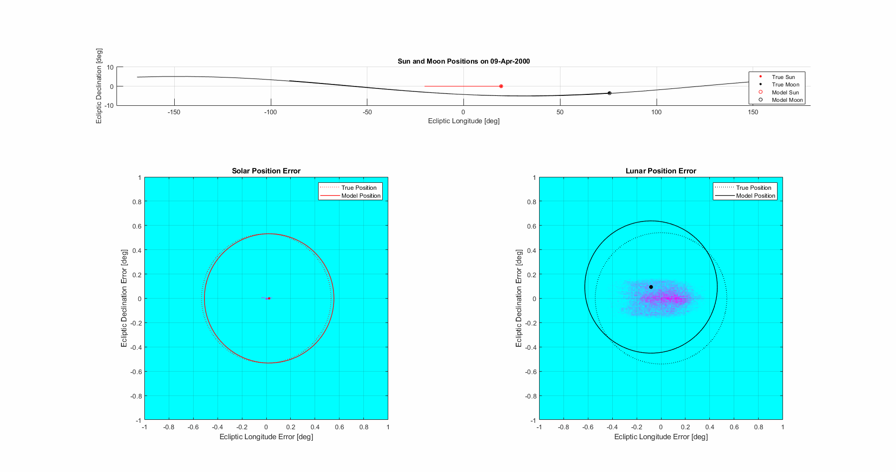 With the required parameters all defined mathematically, let’s take a look at how accurate it is in a few different ways. Let’s start with with just simply determining the position of the sun and moon as seen from an centralized earth observer. We’ll use a fixed mean inclination of the moon’s orbit of 5.14°, in reality it does have a libration but functionally since the influence on position when the moon is at a node goes to zero it isn’t a major source of inaccuracy for eclipses. It’s pretty clear that the sun has minor error in the longitudinal direction, but primarily the moon is showing visibly chaotic motion. Recall that this is after about a 20x reduction through the 5 lunar anomalies, illustrating the complexity of the motion.