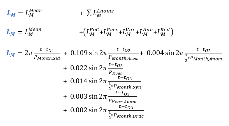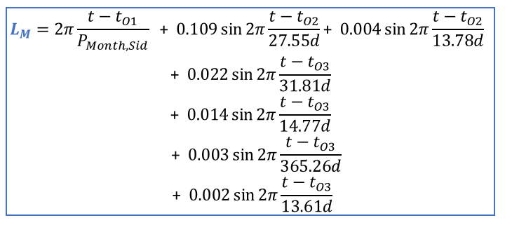 The ecliptic longitude of the moon is the big bad one, the joyous combination of both critical to get right as well as complex to model. While previous terms had mean motion and one or two anomalies in addition, we’ll need a minimum of 5 anomalies (modelled with 6 sine functions) in addition to the mean motion to get anywhere close.