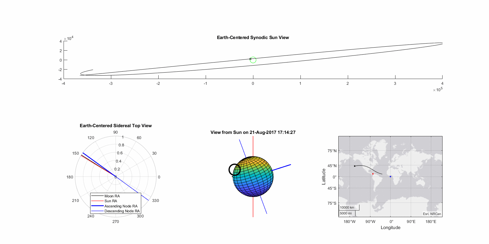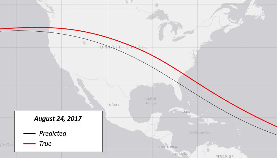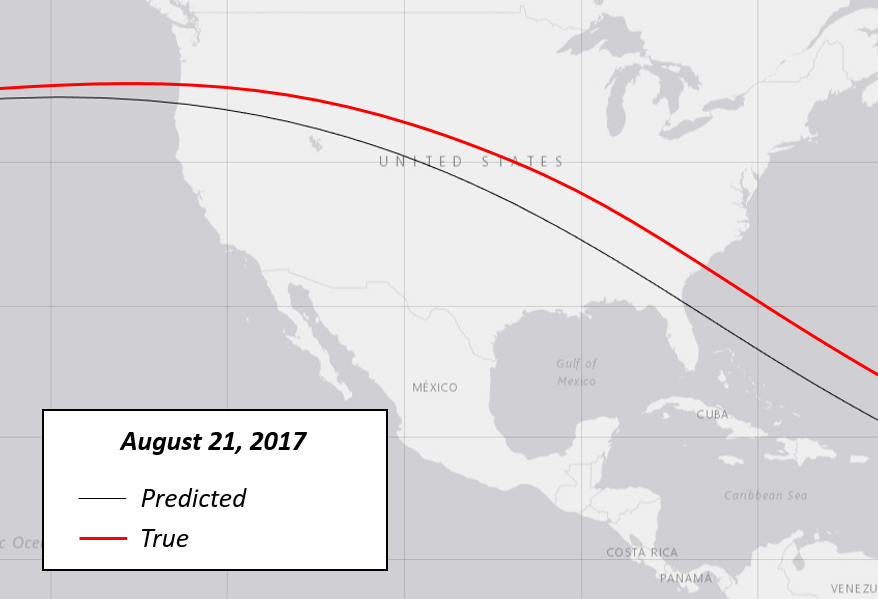 The so-called “Great American Eclipse” was an ascending node total eclipse whose totality path crossed the contiguous United States for the first time in almost a century. Occurring close to the fall equinox and a few days after lunar perigee, the magnitude was 1.03. The model predicted a magnitude of 1.01, an error of -2.5%. True gamma was 0.437 and the model predicted 0.424, an error of -2.9%. The eclipse paths are shown on right, the maximum path error was approximate 70 nautical miles or about twice the width of totality. Functionally, this means that while this model will predict the occurrence, timing, type, and approximate location of the eclipse it is not sufficiently accurate to position an observer in the path of totality reliably.