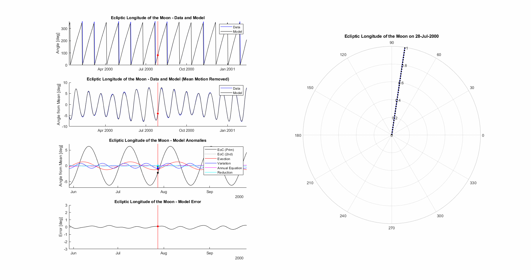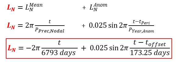 The ecliptic longitude of the ascending node uses the exact same approach as the ecliptic longitude of the sun with a mean motion and a single sinusoidal oscillation over it. The causes of both are different however, the mean motion comes from the nodal precession of the moon’s orbit (which is mainly a solar gravity interaction) and occurs over about 18.6 years and in a retrograde (westward) direction. The oscillation has a period of 173.25 days, which is the time between the sun aligning with successive nodes and therefore eclipse seasons. The magnitude of the oscillation has no mathematical derivation from first principles and ends up around 1.4° or 0.025 rad, interestingly enough large enough to entirely halt the mean motion temporarily. The equation has the same form as before, just with different variables. The accuracy of the resultant modelling function is not quite as good, as to be expected from a more turbulent gravitational environment. Mean error is 0.178°, max error is 0.898°, and 3σ (99.7%) error is 0.680°.