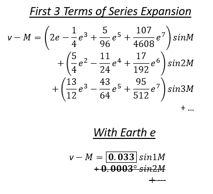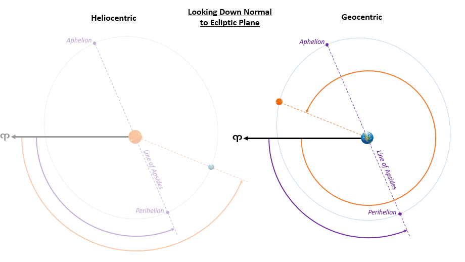 We’re going in order of easiest to most complex and the ecliptic longitude of perihelion is certainly the place to start because it can be considered a constant for most applications. Technically the earth’s line of apsides precesses, but it has a period of about 112,000 years and a small enough influence on the solar longitude that 1000 years of precession still only results in about 15% of a solar diameter error (0.07 deg). This term will get captured as an offset in the ecliptic longitude of the sun instead, and will be compensated for there.