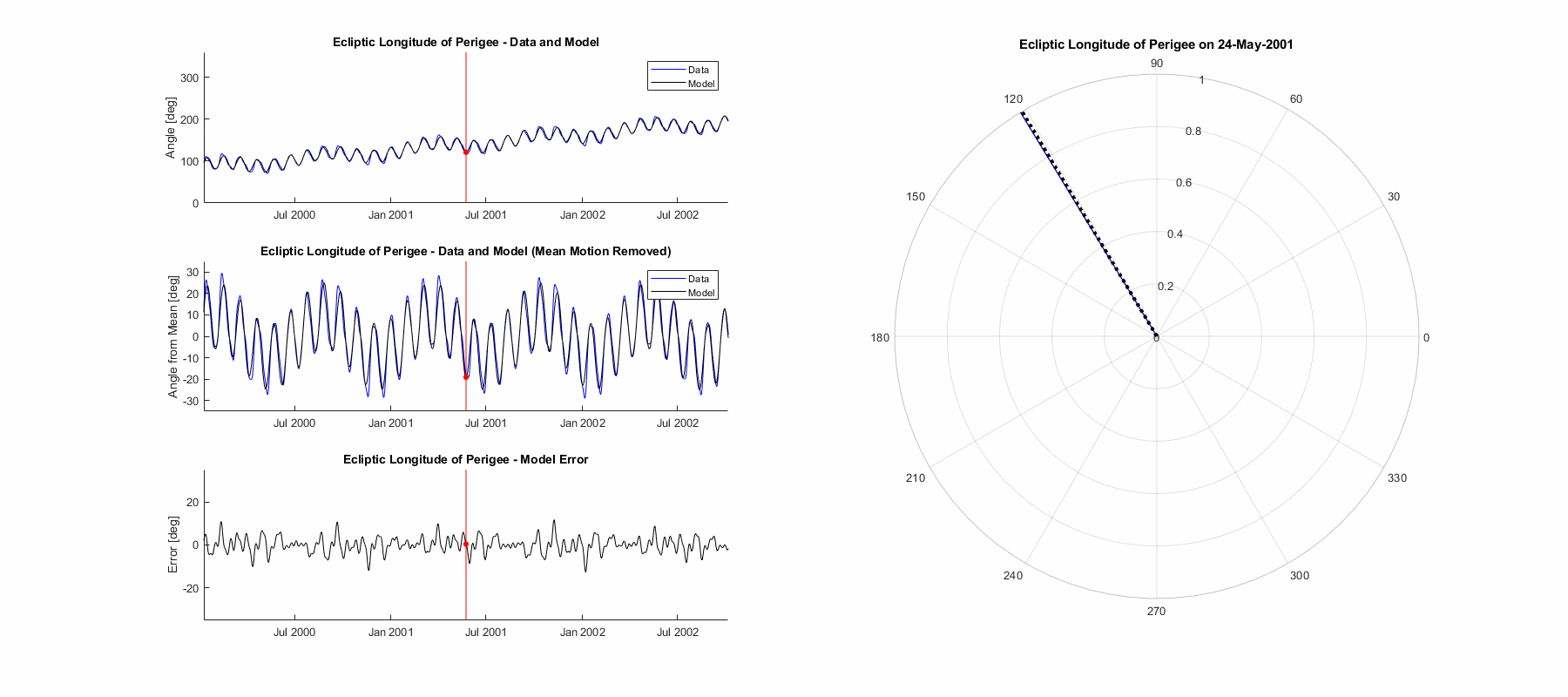 The ecliptic longitude of perigee uses the exact same approach as the previous but has two notable frequencies oscillating over the mean motion instead of one. The first has a period of 31.8 days and a magnitude of 15.4° (0.270 radians), the second a period of 205.9 days and a magnitude of 9.57° (0.167 radians). Note that these are significant perturbations, perigee is by far the most chaotic of the terms and the modelling and resulting accuracy reflect that. Thankfully ecliptic longitude of perigee is only used to characterize the eclipse rather than determine it, so the functional consequence of its inaccuracy (annular vs total vs hybrid type is off) is less drastic than location being off and missing the event. Mean error is 2.9°, max error is 15.3°, and 3σ (99.7%) error is 11.5°.