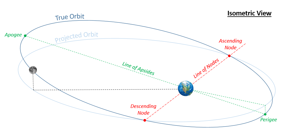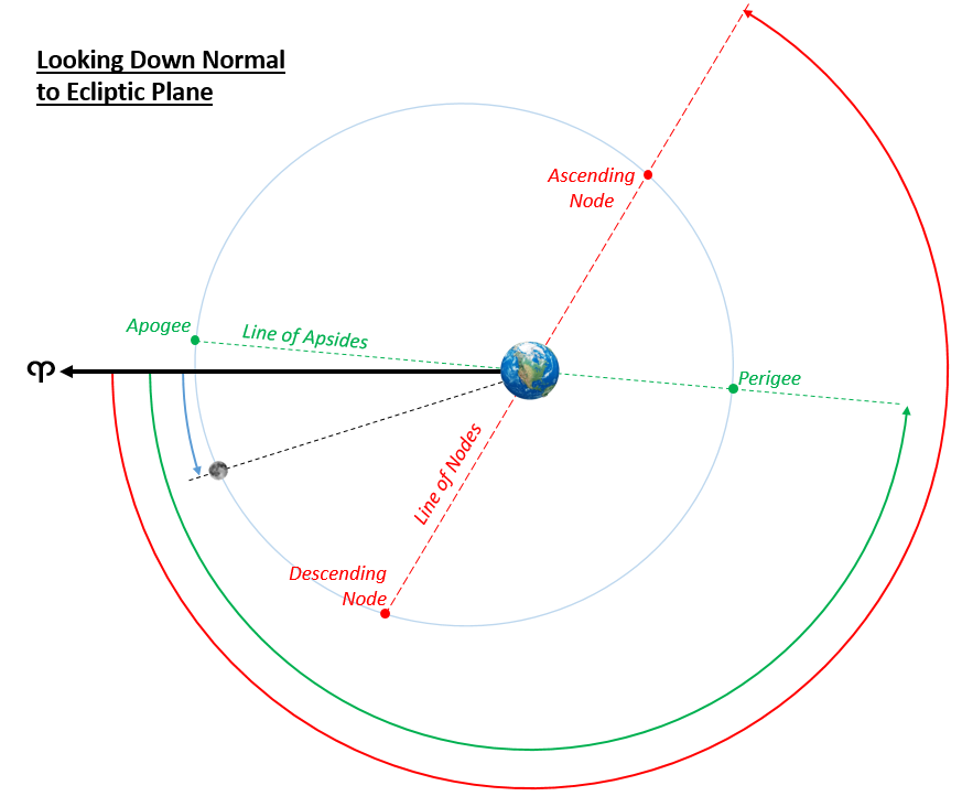 The position of the lunar nodes, since these are at the intersection of the lunar orbit and the ecliptic either could be used without projection correction. I’ll used the ecliptic and again reference from the first point of Aries and to the ascending node, creating the ecliptic longitude of the ascending node. In this instance it is synonymous with the more modern term Right Ascension of the Ascending Node (RAAN) but I’ll use longitude for consistency.