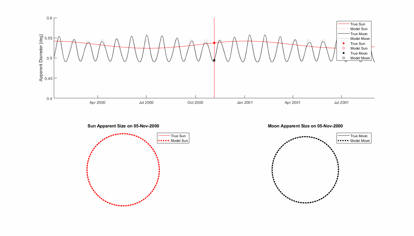 Both sun and moon apparent sizes can be approximated with sine waves as shown below, with periods of an anomalistic year and anomalistic month.
