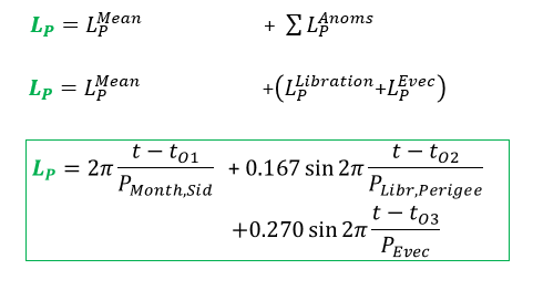 Equation of the Center / Great Anomaly. Primary period of one anomalistic lunar month (27.554 days) although the effect is significant and non-sinusoidal enough that it is appropriate to include a second order approximation at half the period. Primary period amplitude of 6.24° (0.109 rad) and secondary period amplitude of 0.229° (0.004 rad).