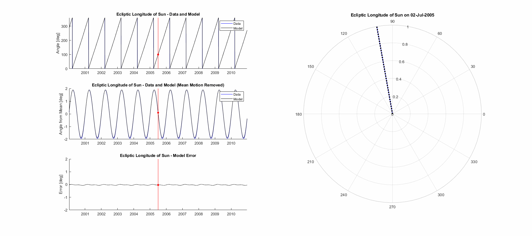 This is the Equation of the Center resulting from Kepler’s Equation, showing the angle increasing faster (i.e. the body moving faster) at periapsis. A direct result of Earth’s orbital eccentricity, we can determine the magnitude of the variation from that value (shown on right). We’re only considering the first order term since the effect of the subsequent ones is so small. This oscillation was originally called the Solar Anomaly, here we can use a sine function to approximate it pretty well. The final equation for the ecliptic longitude of the sun is shown on the right, including the mean motion and the anomaly added to it. Notice also that the solar anomaly term uses an anomalistic year, which is slightly different from the sidereal year. It is different by precisely the apsidal precession rate of 112,000 years for a full rotation mentioned for the ecliptic longitude of perihelion term. This is how that effect is captured as the phase of this anomaly term goes VERY slowly out of phase. The accuracy of the resultant modelling function is excellent, as we should hope for for the simpler terms. Mean error is 0.029°, max error is 0.071°, and 3σ (99.7%) error is 0.066°.