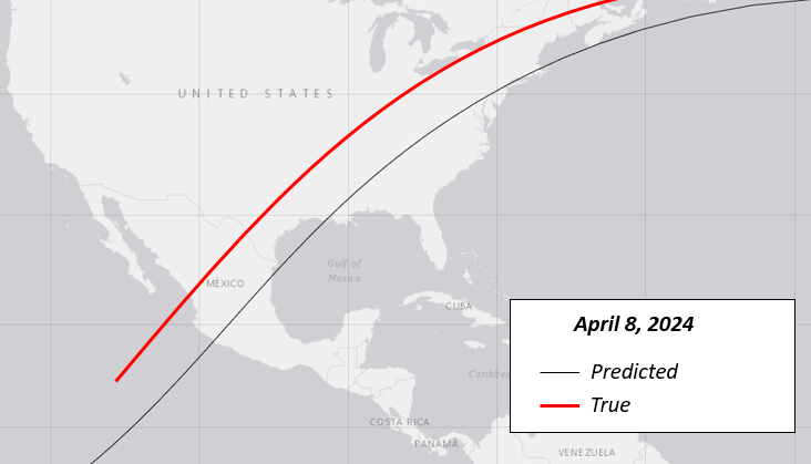 Dubbed the “Great North American Eclipse”, this was also an ascending node total eclipse that primarily crossed the United States. Note that due to it occurring near the vernal (spring) equinox rather than the fall equinox the path of totality progresses south-to-north instead. While ascending node vs. descending node difference effects this angle by ~5° it is dwarfed by the seasonal effect of ~23° from the Earth’s axial tilt. This eclipse occured only a day after lunar perigee, thus the magnitude is relatively high at 1.06. The model predicted 1.02, a -3.6% error. True gamma was 0.34 and the model predicted 0.32, a -7.9% error. The geographic error is larger as seen on right, approximately 100 nautical miles. Again, insufficient to pre-position an observer for totality.