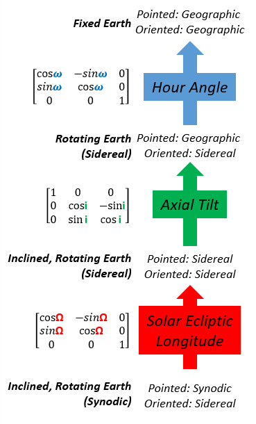 For this next piece we need to understand that the the occurrence of the eclipse occurs relative to the subsolar point. A perfect sun-moon-earth syzygy would cause an eclipse directly on this point, but invariable the eclipse path passes north of this (if the moon is slightly above the ecliptic at minimum solar elongation) or south (if the moon is slightly below the ecliptic at minimum solar elongation). The eclipse path always begins on the west side of the earth and progresses generally eastward but can head north-east or south-east depending on the time of year and which node. The geometry for this is extensive, though not necessarily obscure. Ultimately we need to formulate what the earth looks like from the viewpoint of the sun, and how the moon transits across in that frame. That first part can be done with a discrete series of coordinate transforms that take between a fixed earth frame (for which we can use latitude and longitude coordinates) and a frame pointed along the sun-earth vector. Then we back-track through the coordinate frames to return to geographic coordinates.
