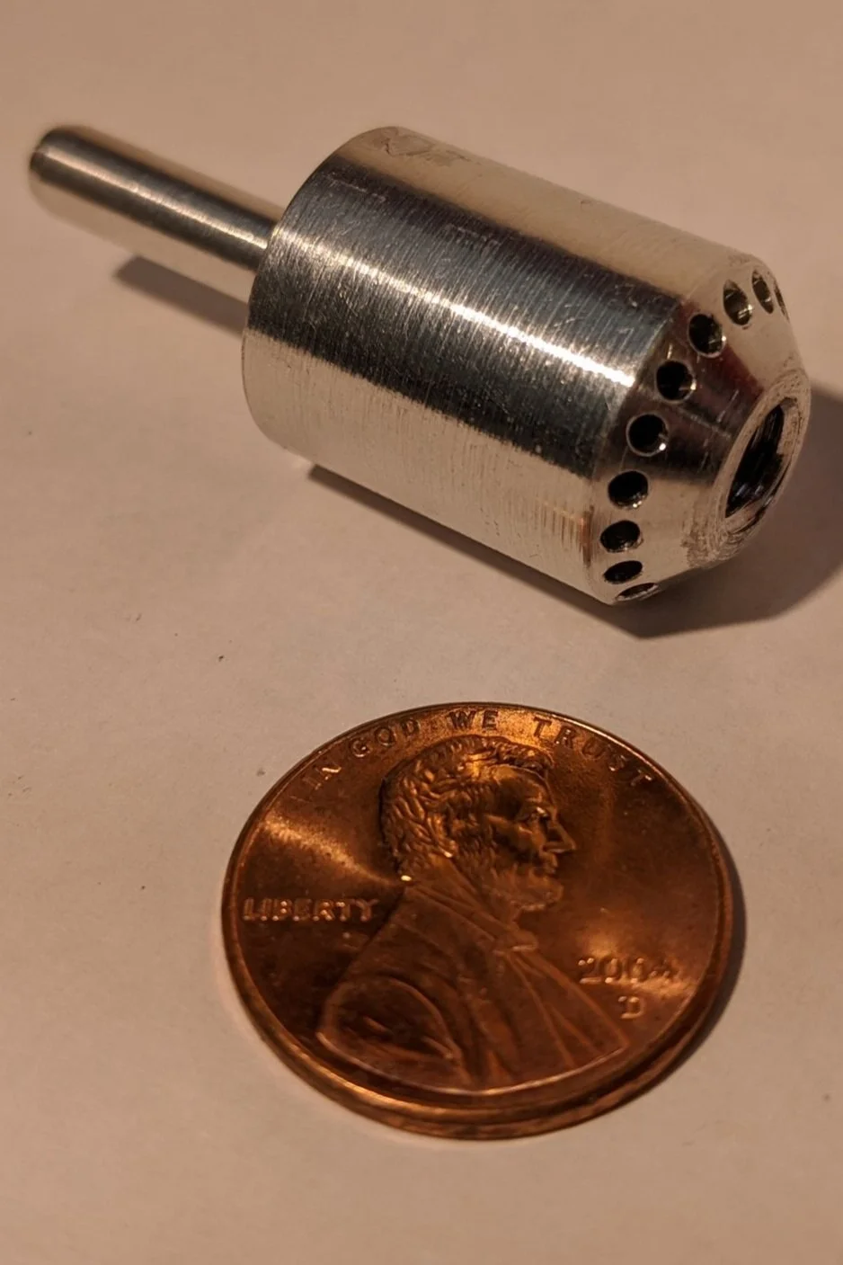 Machining a custom irrigation nozzle from stock with an inlet (left), 24 outlets, and a tapped hole to accept a 1/4-20 bolt.