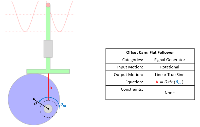 Taking a circular cam and running it eccentrically on a shaft does create a sinusoidal output, so long as the follower is a flat plate perpendicular to the motion of the slider (see also the roller and point variants). The magnitude of the oscillation is simply the offset between the cam center and the rotation center, O.