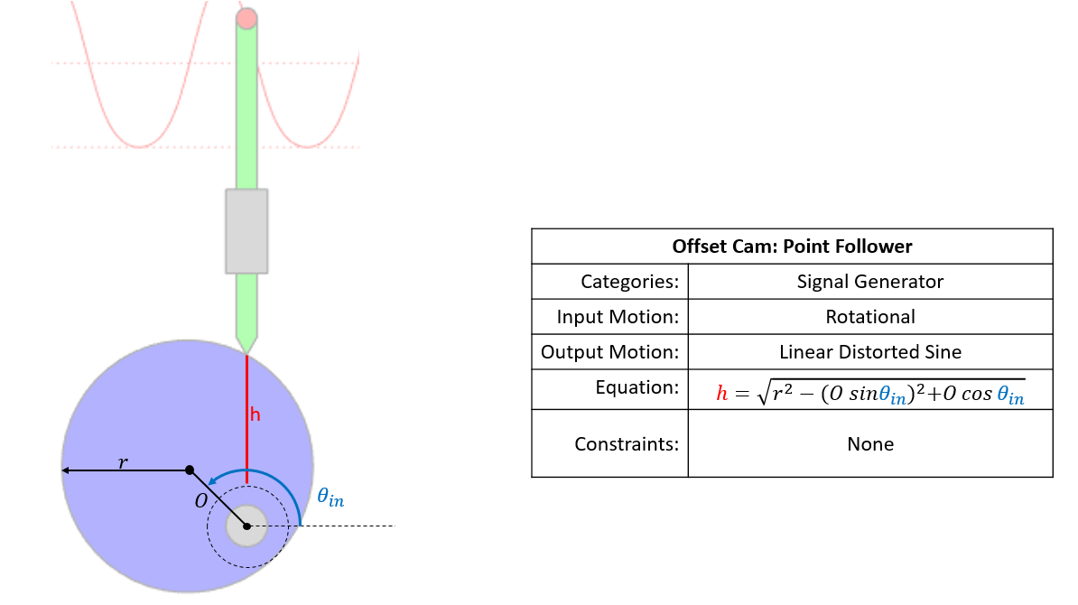 If instead of a flat follower you use a point follower on an offset circular cam, the motion is no longer sinusoidal. The lower dwell time becomes extended and the slider sees higher accelerations into and out of it, approaching infinite as the offset approaches the radius of the cam (high O/r). There are practical limitations with this design, generally infinitely sharp points are not to be found and anything approaching them will wear quickly. There will also be significant lateral forces generate on the slider for high O/r ratios. The magnitude of the oscillation is simply the offset between the cam center and the rotation center, O, same as a flat follower.