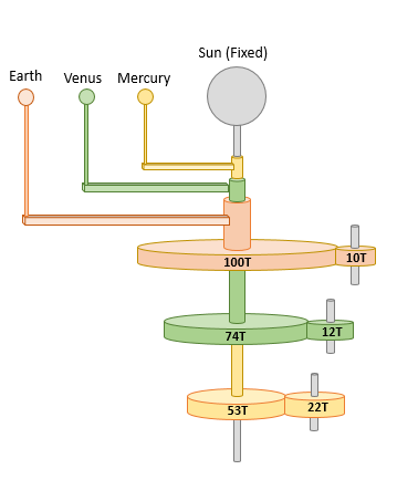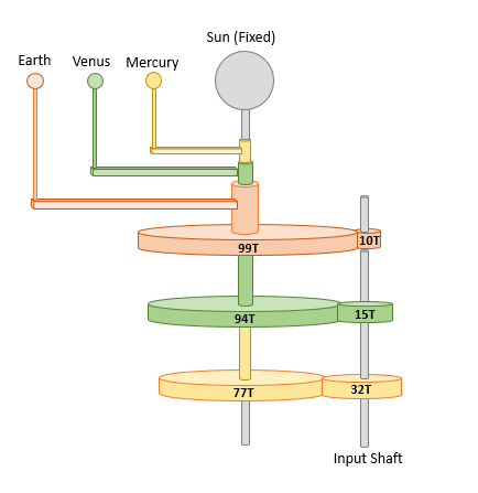 Simple Option: Gear sets adjusted to permit a common input shaft. The sum of each gear pair is 109, and the errors are 0.14%, 1.50%, and 1.01% for Mercury, Venus, and Earth.