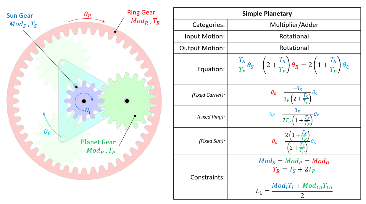 Despite being “simple”, planetary drives have some properties that give them a wide variety of use cases. This is largely driven from the fact that, unlike simple compound gear trains, there are three rotations which can each be either fixed, an input, or an output. This means by fixing each of them three different gear ratios can be created. Additionally, it can function as a rotational summing device in three configurations although due to the unequal gear ratios there is a multiplier difference between the inputs that must be accounted for. Technically only a single planetary gear is necessary, but they are often found with three which balances and allows for higher loading. When using multiple planet gears their are additional restrictions on the number of teeth between the three gears.