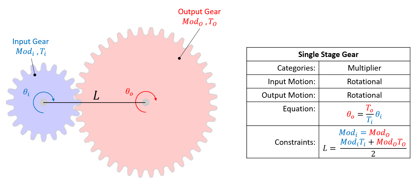 The simplest gear arrangement, the gear ratio is simply the ratio of the gear teeth. The module of the gears must match to ensure tooth meshing, but besides that the teeth can be of any profile: triangular, involute, cycloidal, helical, herringbone, etc. It only gets more complicated from hereā¦